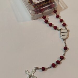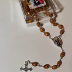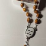Różaniec wykonany jest z drewna oliwnego, co nadaje mu naturalny, ciepły odcień i gładką teksturę. Koraliki różańca są owalne, połączone ze sobą trwałymi, srebrnymi łańcuszkami, co zapewnia jego wytrzymałość oraz komfort użytkowania.